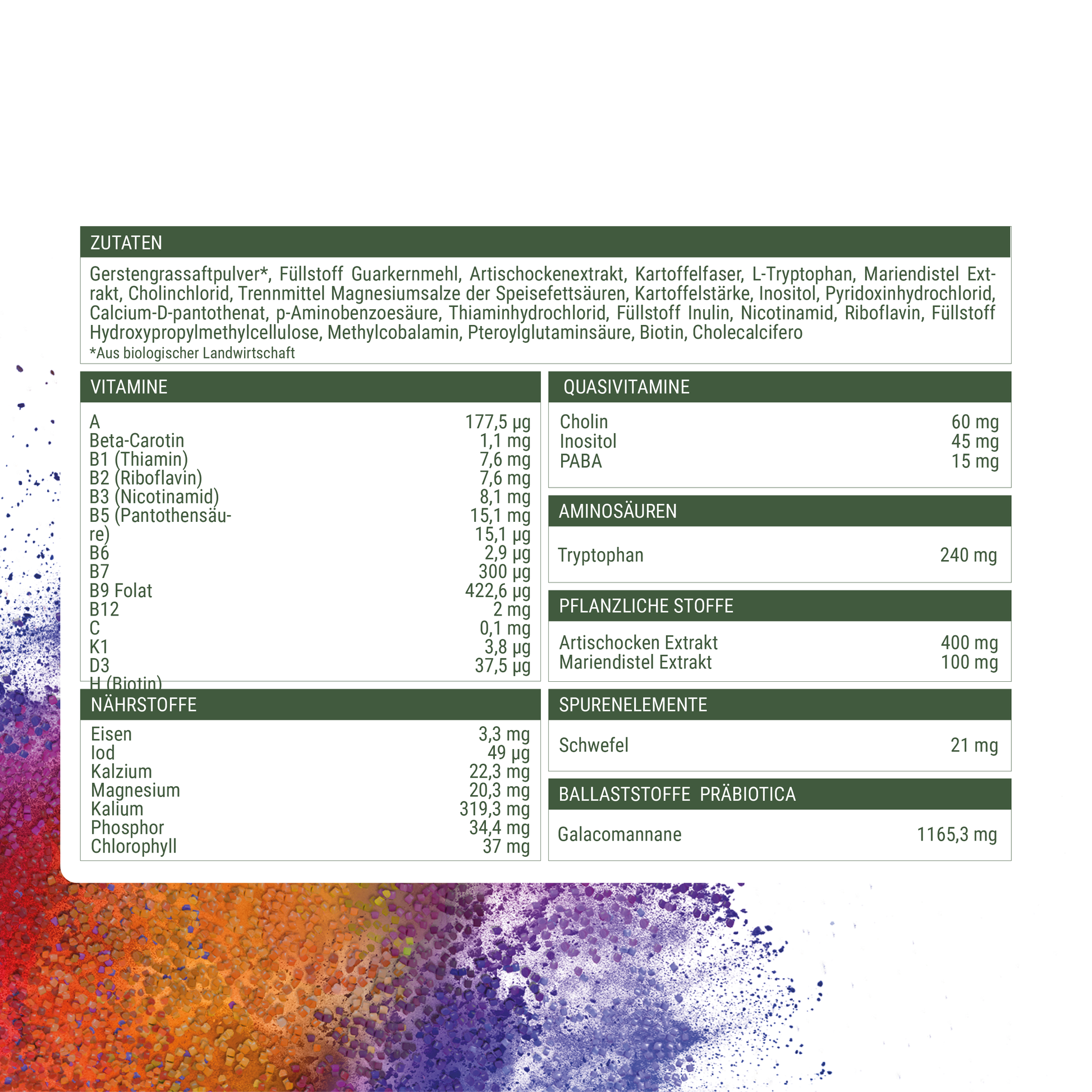 Das Granulat enthält eine kraftvolle Kombination von Inhaltsstoffen, darunter: Gerstengrassaftpulver: Reich an Nährstoffen und Antioxidantien, unterstützt es die Regeneration und das allgemeine Wohlbefinden. Mariendistel, Cholin & Artischockenextrakt: Diese Stoffe sind bekannt für ihre leberunterstützende Funktion. L-Tryptophan: Eine essenzielle Aminosäure, die zur Produktion des "Glückshormons" Serotonin und des Schlafhormons Melatonin beitragen kann. Ein hochwertiger Vitamin B-Komplex (B1, B2, B3, B5, B6, B12, Folsäure, Biotin): Diese Vitamine sind unerlässlich für den Energiestoffwechsel, das Nervensystem und tragen zur Verringerung von Müdigkeit bei.